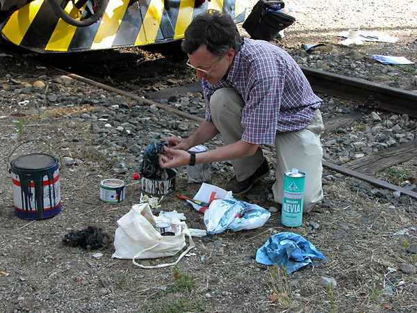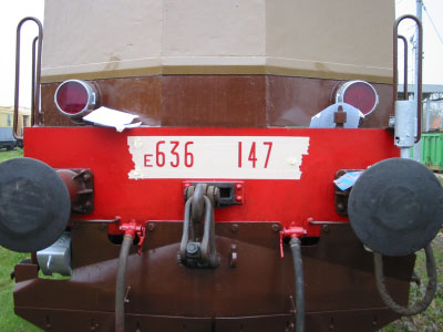 The following photos show the step-by-step painting of front numbers on E.636.147, a (non-working) locomotive preserved in Depot Milano Smistamento and painted in its original brown livery in March 2006.
