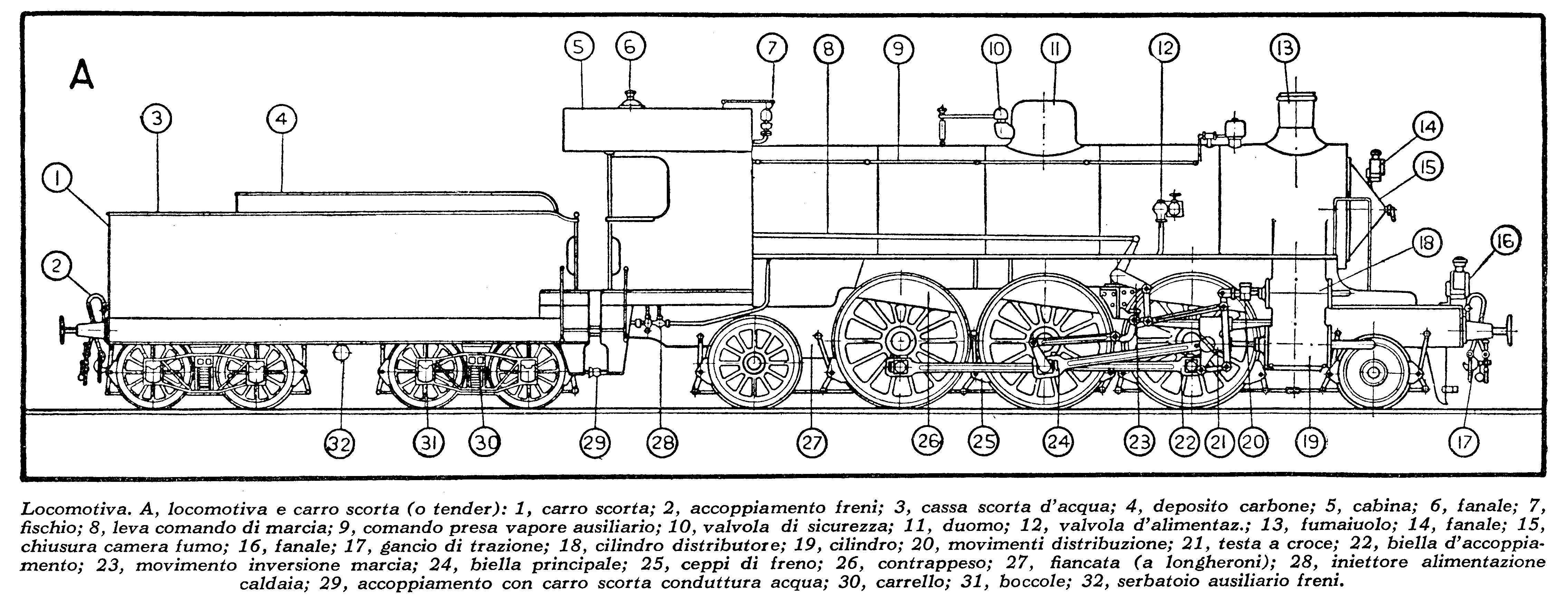 Apri il disegno ad alta risoluzione / Open full size drawingA, locomotiva e carro scorta (o tender): 1, carro scorta 2, accoppiamento freni 3, cassa scorta d'acqua 4, deposito carbone 5, cabina 6, fanale 7, fischio 8, leva comando di marcia 9, comando presa vapore ausiliario 10, valvola di sicurezza 11, duomo 12, valvola d'alimentaz. 13, fumaiuolo 14, fanale 15, chiusura camera fumo 16, fanale 17, gancio di trazione 18, cilindro distributore 19, cilindro 20, movimenti distribuzione 21, testa a croce 22, biella d'accoppiamento 23, movimento inversione marcia 24, biella principale 25, ceppi di freno 26, contrappeso 27, fiancata (a longheroni) 28, iniettore alimentazione caldaia 29, accoppiamento con carro scorta conduttura acqua 30, carrello 31, boccole 32, serbatoio ausiliario freni. |