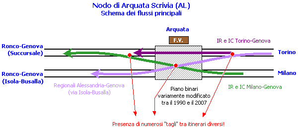 Fig. 1.12 - Scegliere l'interconnessione /3 Dal 1995 al 2007 il piano binari di Arquata è stato continuamente fatto e rifatto: non ricordiamo anno in cui non ci fossero lavori in corso. Solo in tempi recenti, una qualche modifica ha permesso almeno di percorrere a 100 km/h l'itinerario Genova -> Milano (in precedenza tutti gli itinerari tra Milano e Genova comprendevano deviate da 60 km/h). Tuttavia è evidente che la vera interconnessione risolutiva, di cui si danno due possibili versioni in figura, è rimasta un'idea irrealizzata.