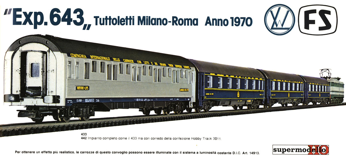 Bella, stellata, ma appena rinfrescata da une leggera aria che s'insinua sotto le grandi arcate vetrate, è la notte di un giorno d'estate alla Stazione di Milano Centrale. Il rumore della città, soffocata dalla calura del giorno, giunge attutito ma è sovrastato dalla voce, quasi senza espressione, che dagli altoparlanti, continua incessante ad annunciare treni in arrivo o in partenza su uno degli innumerevoli binari. Via vai di gente e di carrelli con bagagli si affiancano alle carrozze tutte blu in attesa. Alle 23 e 32 minuti il Milano-Roma partirà, quindi occorre affrettarsi. Sistemazione nelle cuccette che l'aria condizionata riesce a rendere climaticamente abitabili, qualche saluto e quindi la lunga teoria di carrozze del tutto-letti si muove, cercando la sua strada nell'intrico dei binari e di luci multicolori. Breve sosta a Pavia ed in silenzio, ormai quasi tutti dormono, il treno frusciando sui binari s'avvicina agli Appennini che, giostrando tra gole ed anfratti, valicherà par giungere a Genova. Qualcuno s'affaccia ai finestrini, e rimane in attesa di vedere il mare perché tra pochi istanti, dopo Genova, esso apparirà e per un lungo tratto farà compagnia riverberando sull'increspatura delle onde i riflessi argentei della luna. Pisa è raggiunta, poi Livorno e da qui nei chiarori dell'alba un luogo balzo senza soste fino a Roma Termini ove, puntualmente alle 8.30, il viaggio termina. 433 Confezione del convoglio «Exp. 643» tuttoletti Milano-Roma con locomotiva. Il convoglio completo «tutto-letti» prevede la seguente composizione: |